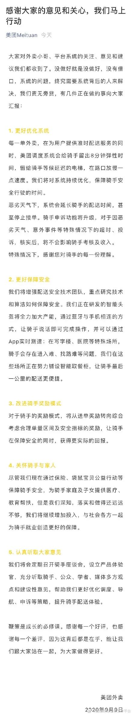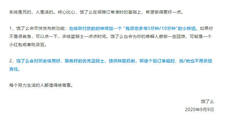 9日凌晨,饿了么平台于9月9日凌晨发布公告:系统是死的,人是活的。将心比心,饿了么在保障订单准时的基础上,希望做得更好一点。