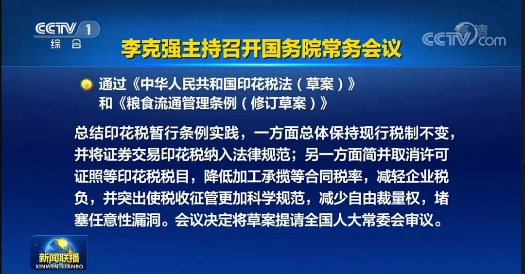 2021年第一个工作日,国务院总理李克强主持召开会议,通过《中华人民共和国印花税法(草案)》,并将提请全国人大常委会审议。