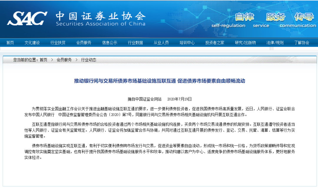 7月19日,央行官网发布《推动银行间与交易所债券市场基础设施互联互通促进债券市场要素自由顺畅流动》指出,央行和证监会同意银行间与交易所债券市场相关基础设施机构开展互联互通合作。