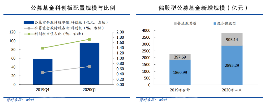 机构目前普遍低配科创。据基金持仓数据,尽管公募基金在 2020 年一季度对科创板持股规模和配置比例均有所提升,但总体依然低配。