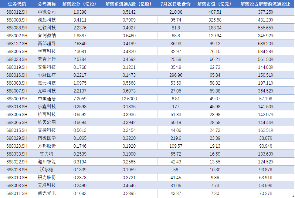 7月,科创板将迎来限售股集中解禁的考验。仅7月22日解禁市值便高达1821.05亿元(按7月20日收盘价计算),是总流通市值4188.22亿元的43.5%,占AB股总市值27363.29亿元的7%左右。